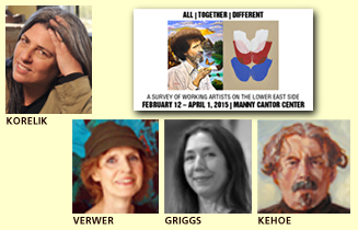 MONDAY MARCH 9 Artist Marc Kehoe, curator Linda Griggs and curatorial adviser Yona Verwer on ALL/TOGETHER/DIFFERENT: A Survey of Working Artists on the Lower East Side, a exhibit at the historic Educational Alliance Art School at the Manny Cantor Center featuring 100 LES artists and arts organizations working in the community; and Jean Korelik, founder and director of BOOKTHEWRITER, an agency for bringing authors and their books to small and large groups of book lovers.